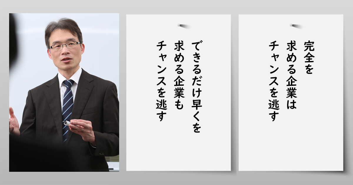 同じように、機を逃す企業によくある意識が、完全なものにするという完璧主義です。お客様に完全なものを提供するために完璧でなければならない、下手に急ぐと不完全なものになるという主張です。