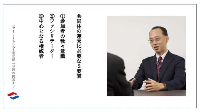 前述の書籍の中でも共同体における「オーナーシップ」(われわれ意識)の重要さを説いています。共同体を上手にまとめていくには、参加者の「われわれ意識」とファシリテーター、そして共同体の中心ともなるべき権威のある人の3つ必要なのだということになります。上手に共同体を運営するための3要素を意識して揃えていますか?