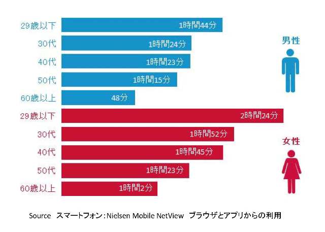 1 日あたりのネット利用時間は、スマホの1 時間48 分に対し、PC は54 分で、性年代別に見ると、グラフの通り「29 歳以下の女性」が突出して利用時間が長く、1 日あたり2 時間24 分利用している。全体では、女性が男性よりも長く利用する傾向がみられる。