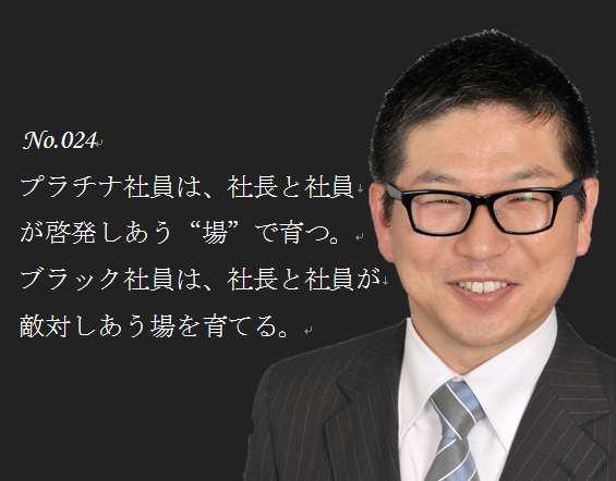 社長は、こうした敵対的な動きから、会社を守り抜かねばなりません。そのためにも、これまでのマネジメントスタイルや不安を乗り越えて、前述の”場”を誰よりも積極的に活用し、管理職はもとより、一般の社員もそこに参画させて、”経営は常に現場と共にある”というメッセージを発信し続け、プラチナ社員に育成していくことが肝要なのです。