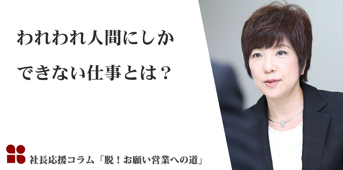 経営者の皆さま。御社の中には、「その人がやらなくてもいい仕事を、全部自分でやってしまっている営業マン」や、逆に、「効率化することが手柄である」かのような味気の無い体制が存在していませんか?何を人が行って、何を機械化するのか?明確な線引はできていますか?人間でなければ出来ない仕事を大切にし、情熱と真心で顧客と接する余裕をつくらなければ、組織は疲弊するばかりですよ。