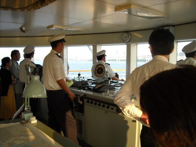 まず船長が「Starboard」(右へ変針する場合)と号令を掛けます。昔は「面舵」と言っていました。操舵員は「Starboard」と復唱し舵を右に回します。舵角指示器を見て舵が右15度まで回ったのを確認し、「Starboard, sir」と報告します。船長は舵角指示器を自分でも見て、間違いなく右15度に舵が動いていることを確認します。操舵員に右と左を間違われたら大変だからですし、また、自分も本当は変針したい方向と逆の指示を出したりしていないのかを確認するためです。そして、所要の針路になる少し前に舵を戻すため「Mid-ship」の号令を掛けます。これは舵を中央に戻せという指示です。