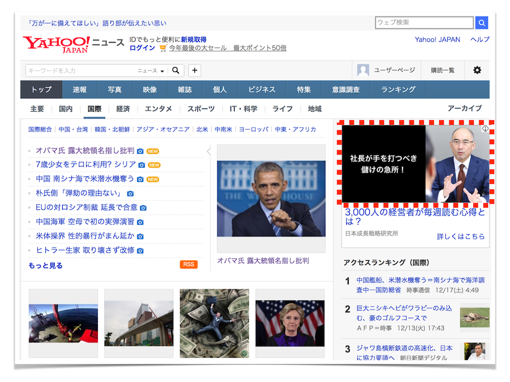 「もし、Yahoo!ニュースなどアクセスの多いメジャーサイトのトップページに、自社の商品やサービスの広告を大々的に出すことができたら...」そう思っている経営者の方は少なくありません。「そりゃ、出せるものなら出したいけど、結構するでしょ?」と言うのが共通の思い。問題なのはやはり予算です。実際の広告掲載面はこんな感じです。