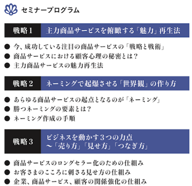 当セミナーでは、商品サービスに関わる実務約20年、メーカー勤務時代と中小企業の売上拡大支援の現場で叩き上げた秘伝の手法を公開。経営をめぐる厳しい状況下、商品を丸ごと一新するのではなく、御社の強みを生かしながらリニューアルし、仕組み化することが要請されています。