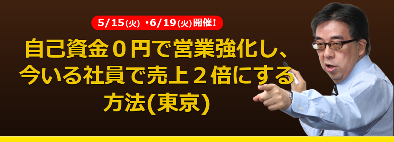 2018年5月15日(火)開催 14:00〜16:15(開場13:45 予約受付中 (東京) 自己資金0円で営業強化し、今いる社員で売上2倍にする方法