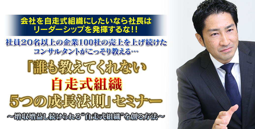 自走式組織の「5つの成長法則」を取り入れ、全社員が少しずつ成長し、目標に向かって知恵を出し、自ら走る組織を創りませんか?