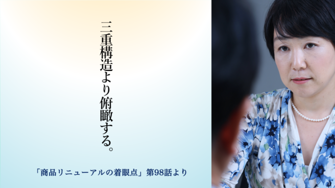 商品リニューアルの三重構造は、時代が変化しても変わらないものです。新しい年を迎えるにあたり、社長であるご自身が「皮膚感覚」として感じる時代の流れを読みながら、ぜひ商品サービスのブラッシュアップに取り組んでください。人間界の営みでは「年末」という括りですが、御社の商売道は連綿と続いているはずです。三年後、五年後、そして100年後から逆算する。小さくまとまらないで、ダイナミックに大きく、そして具体的に考えるのがポイントです。日々無常。季節がめぐるように、昨日と同じ今日はありません。このシンプルな事実から、御社のビジネスもリニューアルを繰り返しながら発展してゆくことが自然です。商品リニューアルこそ経営そのもの。「新しい明日」は、御社の第一歩からはじまるのです。2019年も渾身でお導きいたします!