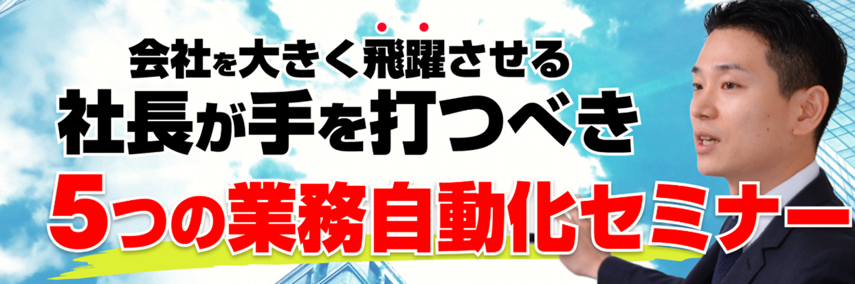 セミナーの中で、これまで10年以上にわたり、30社以上の企業様への経営コンサルティング経験から編み出した、「社長が手を打つべき5つの業務自動化」と「業務自動化」の抑えるべき急所を徹底公開します。