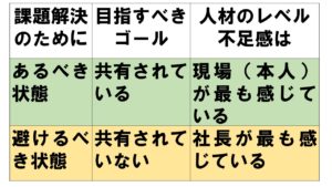 上の表を見てください。今日のテーマは人材のレベル不足感についてなのですが、それは「誰にとっての不足感なのか?」という点が大きなポイントになってきます。「もしかして社長ご自身こそが社員のレベル不足感を感じているのではないですか?」という問いかけにあなたはどうお答えになりますか?