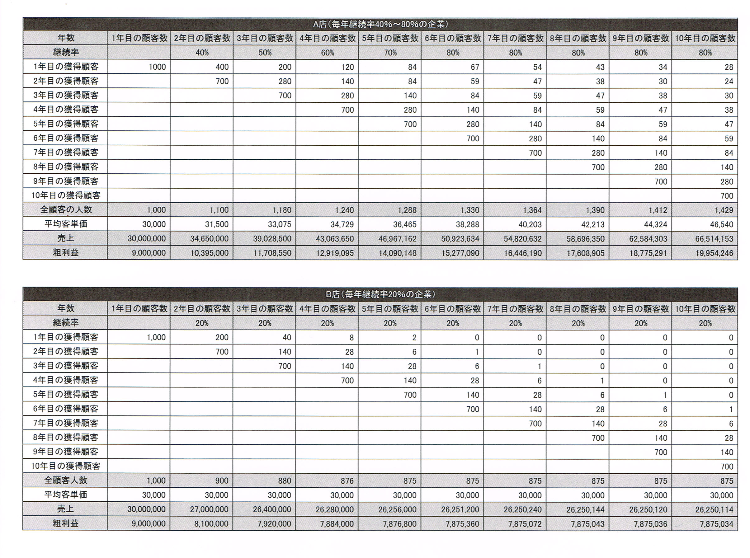 A店では初年度1000人から5年後の段階で288人、10年後には429人顧客数が増えています。一方、B店は初年度1000人から5年以降125人顧客数が減っています。A店とB店では新規顧客の獲得数が同じなのに、A店の顧客数の方が5年目で413人、10年目で554人多くなります。