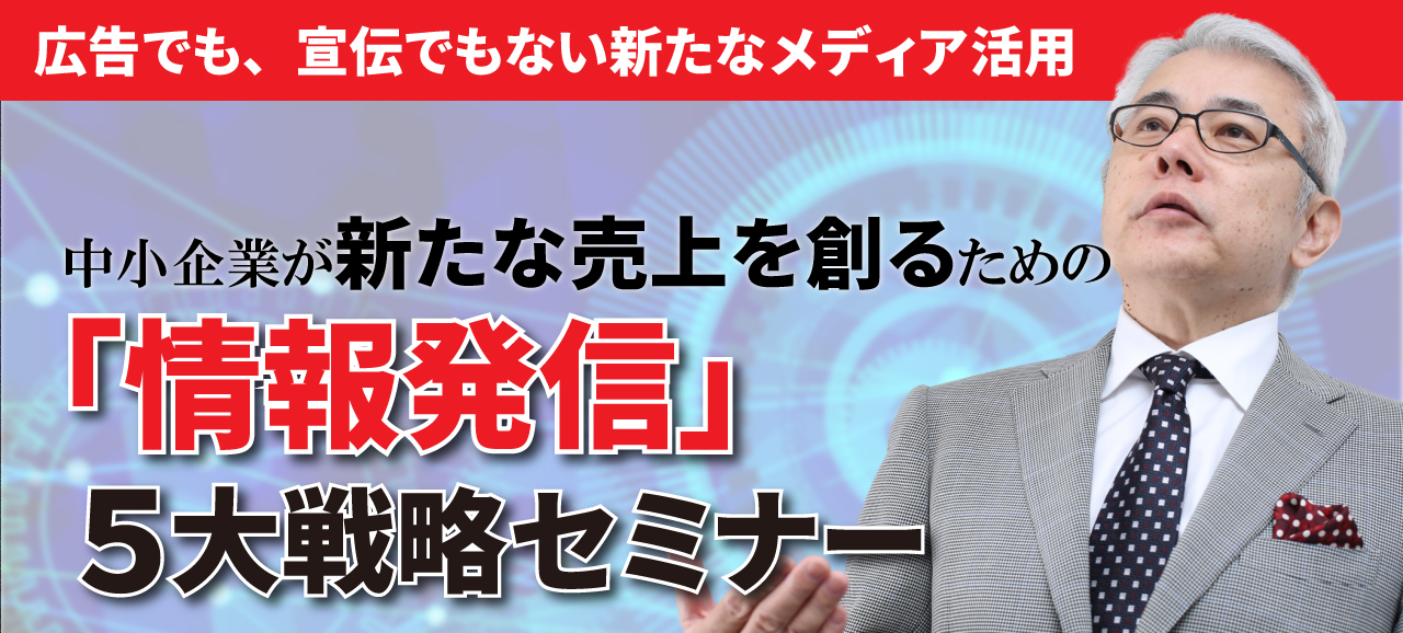当セミナーでは、業績を大きく伸ばすための企業情報発信戦略のノウハウを詳しく解説いたします。中小企業に特化して「情報発信戦略」のコアをお伝えできるセミナーは、他にありません。当セミナーを受講され、アフターコロナにたくましく生き残る術を習得されることを強くお勧めします。
