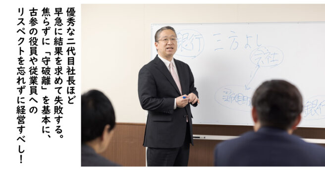 二代目社長の目には、どんなに時代遅れで非効率なことだとしても、これまでなされてきたことには必ず意図や背景があります。それらをきちんと認識することもなく、一刀両断のごとく改革を強行すれば経営どころではなく組織はバラバラになってしまいます。