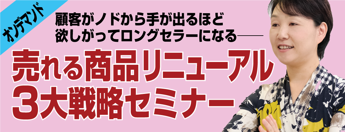 商品リニューアル手法とは、「今ある商品」で売れつづける仕組みづくり。時代の変化に合わせながら、強靭に生き抜く「ロングライフ経営」を叶える商品戦略です。
