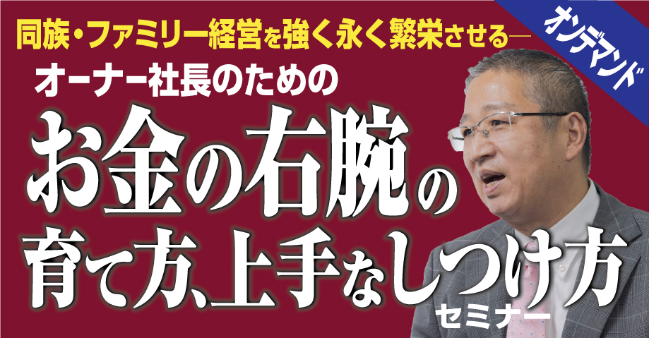 本講では、同族経営・ファミリービジネスの事業繁栄に必須の、「お金の右腕」をどう育てていけばいいか、さらに、「謀反を起こさせない」ために、どう体制をつくり、しつけていけばいいか…について、数多くのオーナー社長と関わってきた金融のプロフェッショナルが、その重要ポイントを分かりやすく解説する貴重なセミナーです。