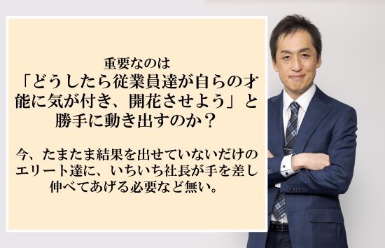 重要なのは、眠れるエリート達はどうしたらその秘めたる才能に自ら気が付き、開花させようと動きはじめ、やがて会社の業績を上げ続けられる人達となれるのか?