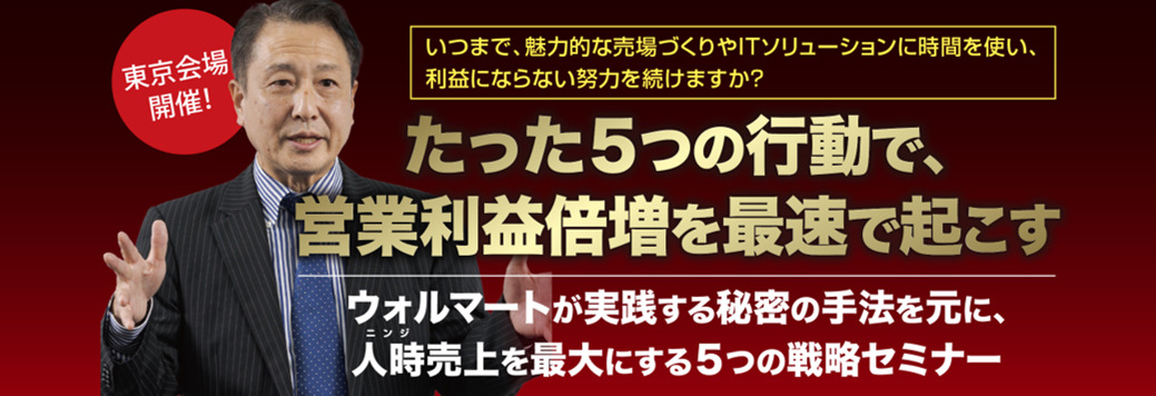 当セミナーでは、米国ウォルマートが実践している人時生産性改革に関わってきた伊藤が、国内企業が、人時売上を高めていくための5つの秘訣をお伝えします。