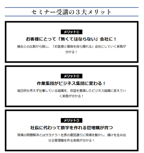 当セミナーは、小さな会社が業界平均を軽く超えていく収益力・成長力・賃金水準を付けていくための、社長実務をお伝えします。