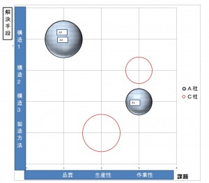 このような手順で作成するマップとして、例えば「バブルチャート」というものがあります。(下図参照)。