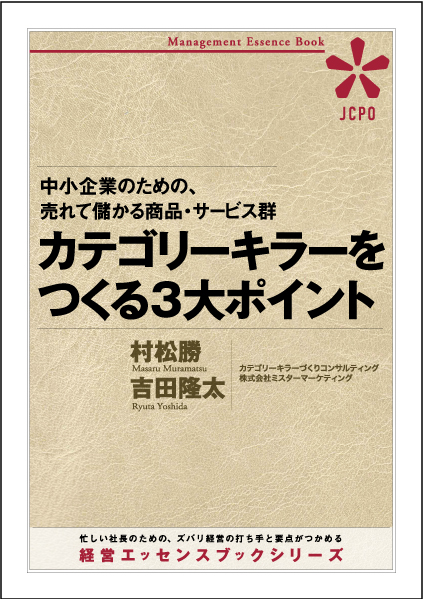 忙しい社長が30分で要点をつかめる、JCPO社長のためのエッセンスブックシリーズ。中小企業が、売れて儲かる商品・サービス群 カテゴリーキラーをつくる具体ポイントを、分かりやすく提示。